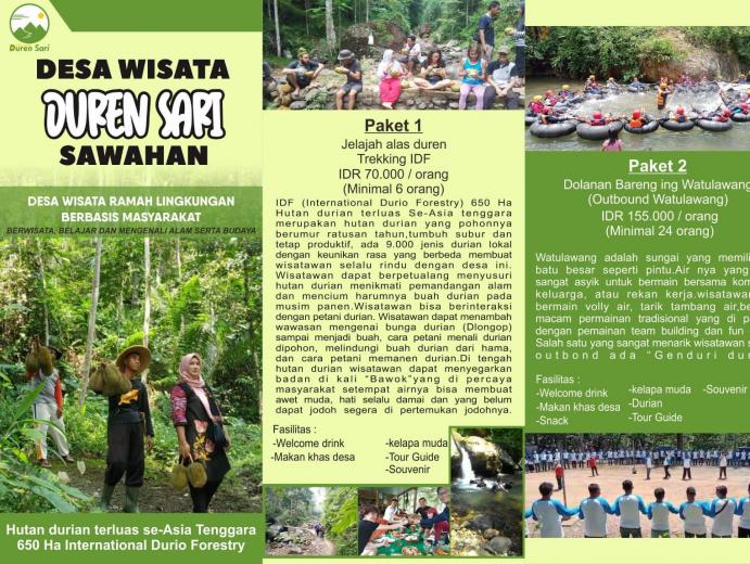 Keunikan dan keindahan Desa Wisata Duren Sari Sawahan ditunjukkan melalui bentang alam International Durio Forestry (IDF) menjadi salah satu daya tarik utama . IDF merupakan hutan durian terluas se- Asia Tenggara 650 ha yang pohonnya sebagian besar sudah berumur ratusan tahun, ditanam pada zaman penjajahan dan masih tumbuh subur sampai sekarang. Masyarakat selalu menjaga dan melestarikan hutan tersebut. Wisatawan dapat trekking IDF dan mengenal berbagai jenis durian, belajar pembibitan durian hingga pengolahan produk durian. Ada ribuan jenis durian lokal dengan keunikan rasa yang berbeda membuat wisatawan selalu rindu dengan desa ini. Wisatawan dapat menghirup segarnya oksigen hutan dan dapat berinteraksi dengan petani durian, menambah wawasan sekaligus bisa menikmati durian yang jatuh langsung dari pohon pada musim panen. Selain durian, buah manggis juga melimpah di desa ini yang panen bersamaan dengan musim durian.