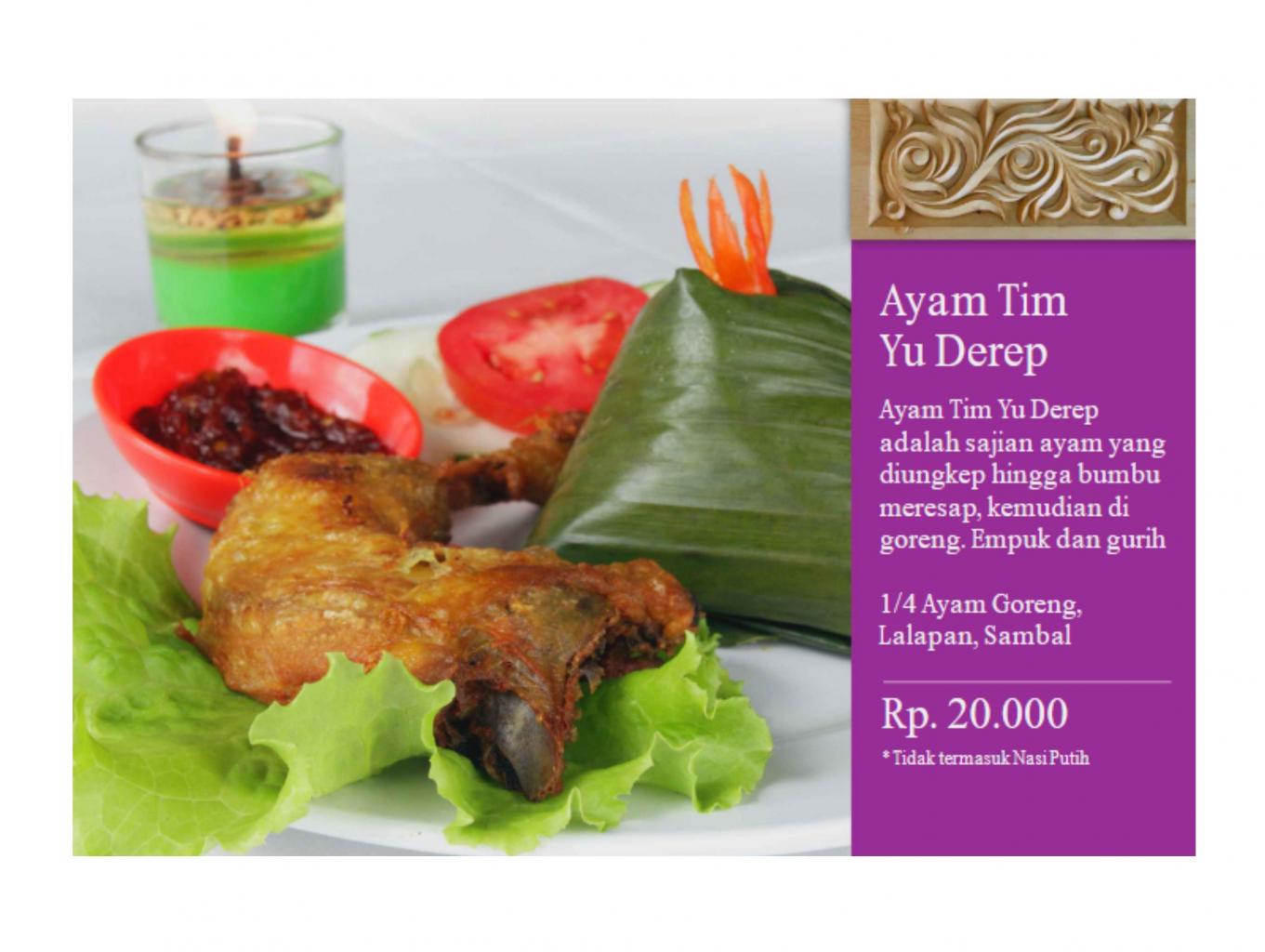 Ayam Tim Yu Derep adalah sajian ayam yang di ungkep hingga bumbu meresap, kemudian di goreng empuk dan gurih