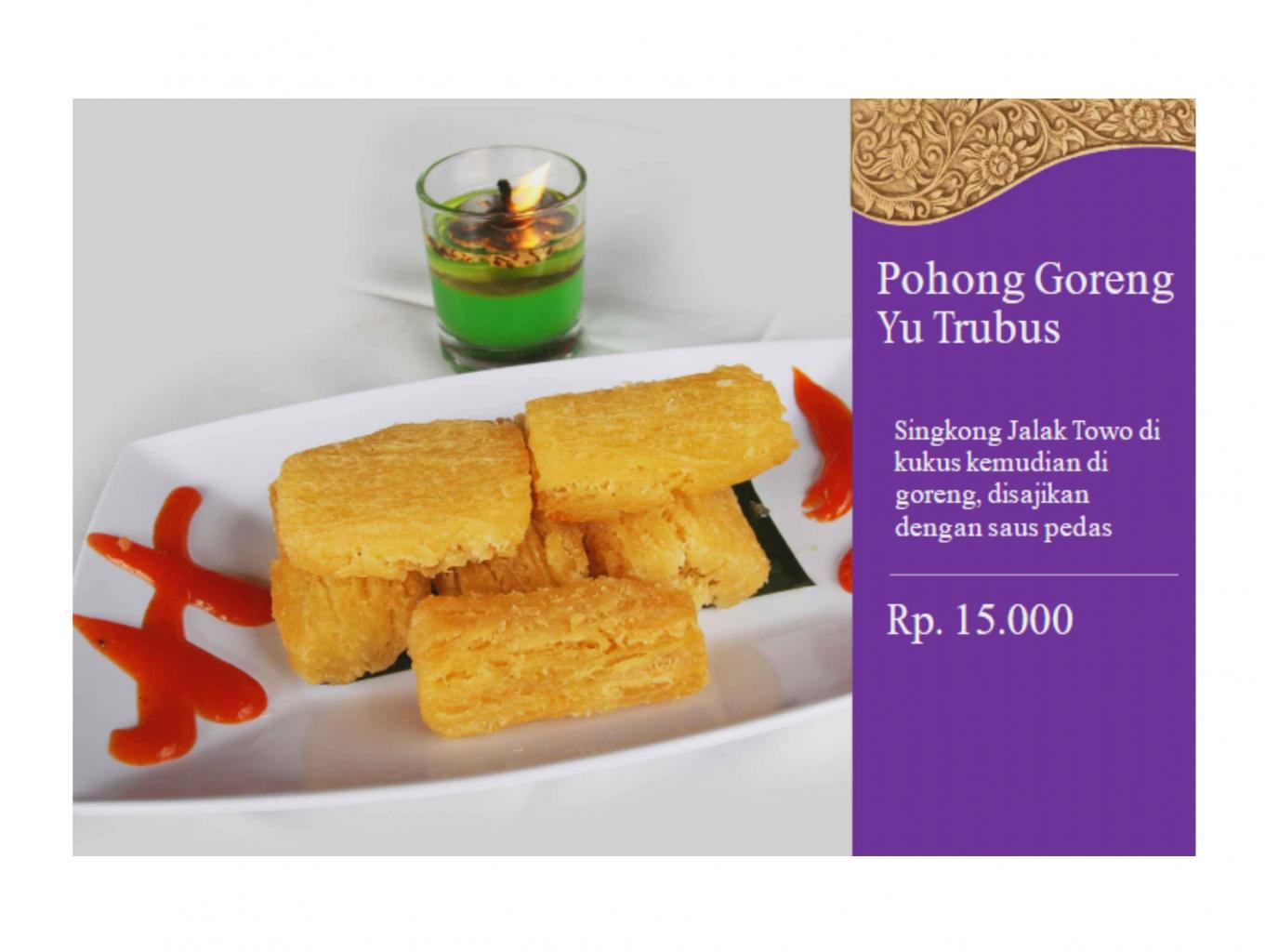 Singkong Jarak Towo di kukus kemudian di goreng, disajikan dengan saus pedas